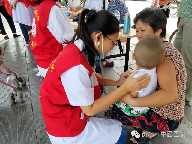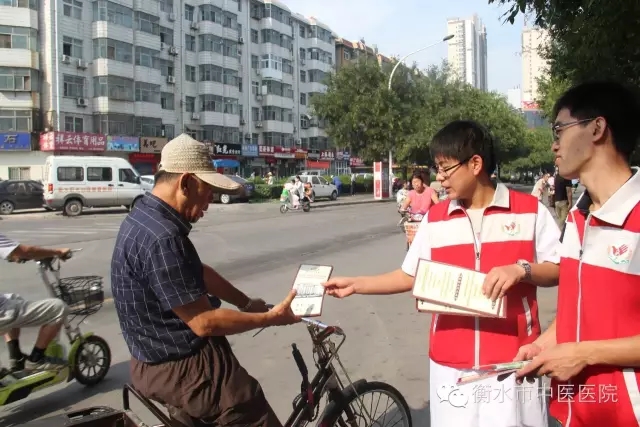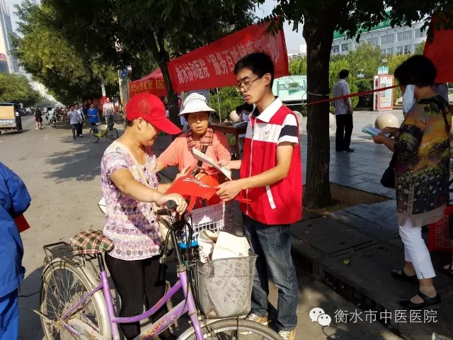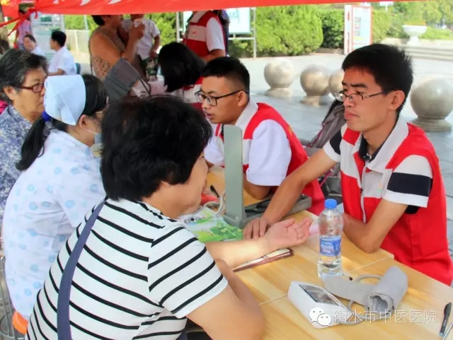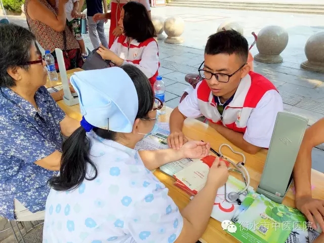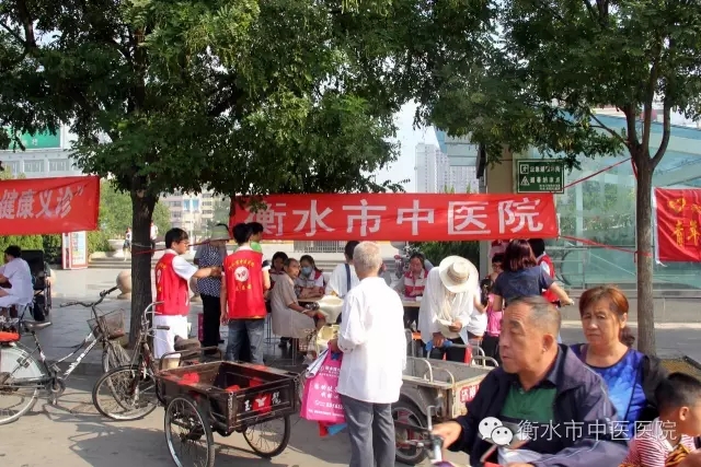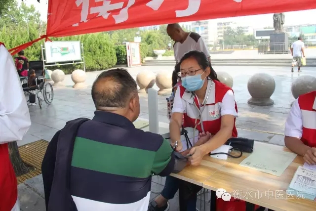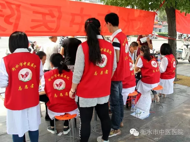 清早,医院“五进”义诊队的肺病科(内科一病区)、心血管病科(内科二病区)、脑病科(内科四病区)、肿瘤科(内科五病区)、针灸理疗二科,以及由医院团支部、青年文明号、河北中医学院学生组成的志愿服务队,在苗书虎副院长的带领下率先赶到市休闲广场,迅速地悬挂条幅、布置桌椅、摆放诊查设备和健康宣教资料。很快,过往的群众就纷纷驻足,排队候诊查。医生们麻利的为群众们听诊、测量血压,以“望闻问切”细心诊治。并结合初秋时节特点,为人们宣教顺时养生、健康注意事项及中医养生保健知识。针灸理疗科的医生还为患有颈肩腰腿痛和关节疾病的群众现场进行手法推拿和针灸,疗效当场立现。河北中医学院针推系学生也学以致用,协助医生进行推拿治疗,人们无不拍手称赞。医院青年志愿者们有的协助医生诊查,有的疏导排队等候的群众,有的沿街发放中医药宣教资料……虽然十分忙碌,但他们脸上无不洋溢着乐于奉献的笑容,用志愿义举和蓬勃朝气感染着每一个人。他们身上被汗水浸透的“红马甲”,也在众多义诊医院中显得愈发鲜艳和照人。