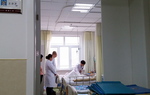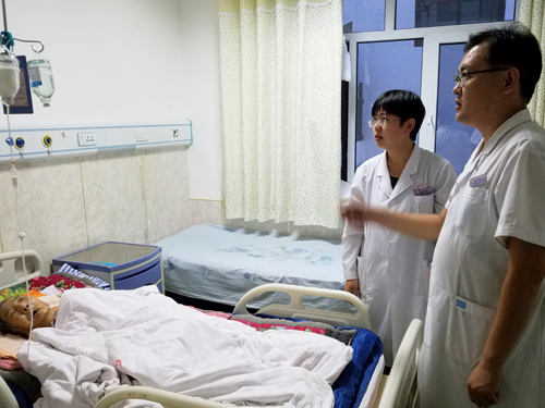 国庆节期间,刘银鸿主任坚持带领医生查房,仔细为住院患者查体,调整诊疗方案。