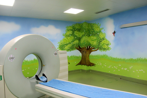 CT室墙绘蓝天、草地、绿树......消除患者CT检查的幽闭和恐惧感,营造放松惬意的环境。