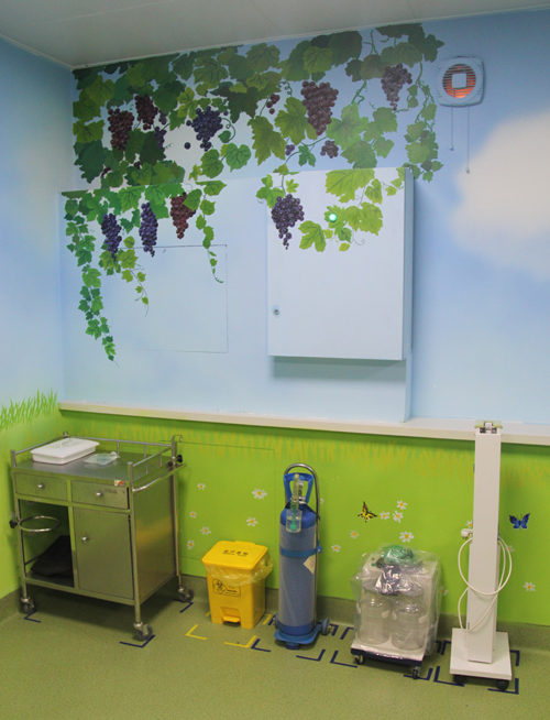 CT室在目视化管理中,对各类器具定置摆放。墙绘的串串葡萄仿佛象征着医院6S管理结出的累累硕果。