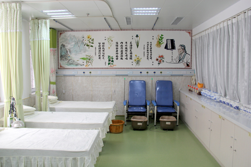 肺病科病区中医综合治疗室,选取“五色”养生中白色为主色调,配以古代名医、中草药花卉墙绘,特色凸显。