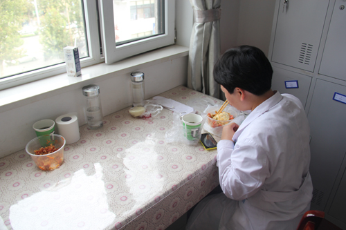 10月4日中午1:50,“把我饿坏了,赶紧吃口饭,今天我值24小时”,脾胃病科张新庆医生草草的吃着所谓的午饭。咸菜、早已放凉的米饭,简单的不能再简单,却透出她对患者和工作的万分热忱。