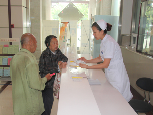 10月2日上午,一站式服务台人员耐心为两位刚从农村来的患者讲解并带领他们挂号、就诊。