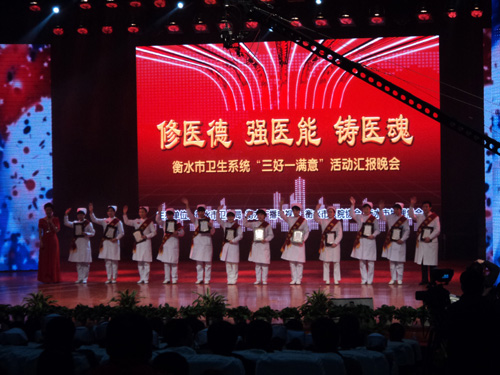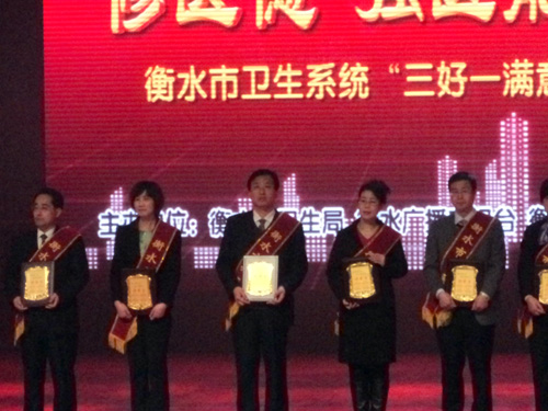 3月20日晚,由衡水市卫生局、衡水广播电视台、衡水市医院协会、衡水市护理学会主办的衡水市卫生系统“三好一满意”活动汇报晚会在冀州市文化艺术中心隆重举行。我院在众多参评单位中脱颖而出,荣获“百姓满意医院”称号,我院田建军院长,医生刘荣顺(外科)、胡凤瑧(针灸理疗一科),护士李会芳(手术室)、李艳伟(急诊科)分别荣膺“优秀院长”、“好医生”、“好护士”称号。
