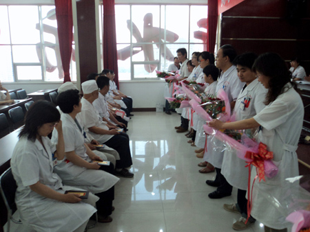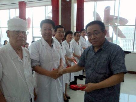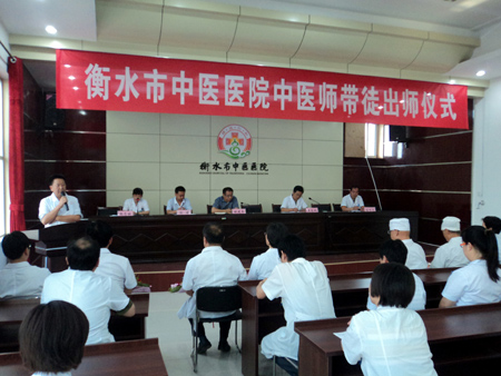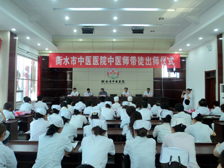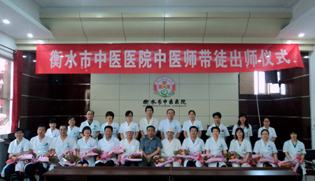 2011年4月,我院正式启动了院内“中医药专家学术经验继承工作”,院内“河北省首届名中医”李英杰、刘兴远、马艳东,“衡水市首届名中医”史志刚、李萍、刘银鸿等名医与12名徒弟确立了教学关系。经过2年辛苦师徒授学,如今12名学术继承人顺利出师。出师仪式上,田建军院长为不辞辛苦、言传身教、授艺带徒的指导老师发放了带教费。并为跟师学习中“跟名师、读经典、做临床”等方面表现突出的3名学生发放了优秀学生荣誉证书和奖金。随后,指导老师为各自的学生颁发了出师证书。同时,学生向老师赠送了鲜花,并鞠躬致谢。全院职工都深深地被这种尊师爱徒、团结和谐、积极向上的气象感染和鼓舞。