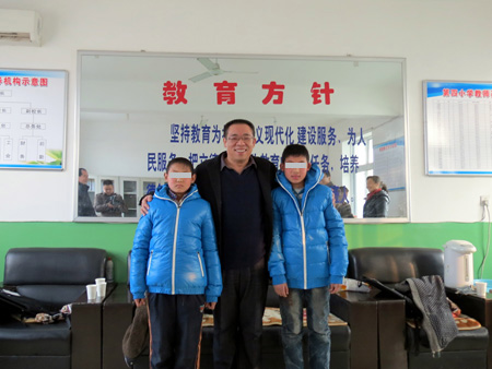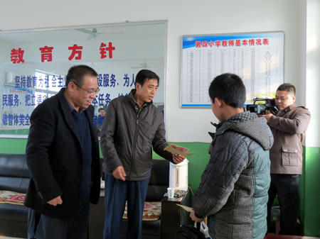 田建军院长(左一)向每位留守儿童发放助学慰问金1000元