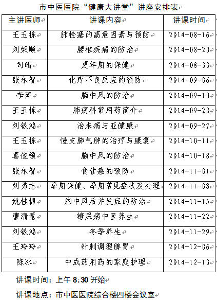 为方便市民朋友来院参加“健康大讲堂”活动,医院现将下阶段讲课安排表公示如下: