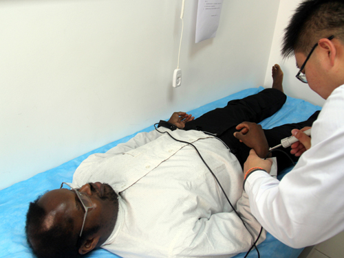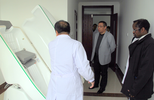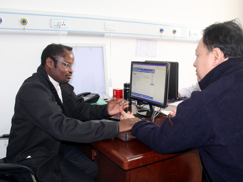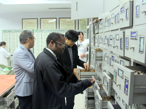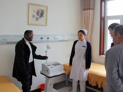 医院田建军院长携干部职工热情接待了迪亚拉博士和文博老师,向他们介绍了医院基本情况和中医药养生文化开展情况,先后参观了中医治未病中心、中药房、制剂室、中医综合治疗区、名医堂及内科三病区(脾胃病、肿瘤)等区域。在中医治未病中心,他们亲身体验了现代化的中医经络测评,对蜡疗、茶疗及音乐疗法表现出浓厚兴趣。并对医院传承和发扬中医药文化,将现代科技与传统疗法完美结合推广中医养生文化赞不绝口。