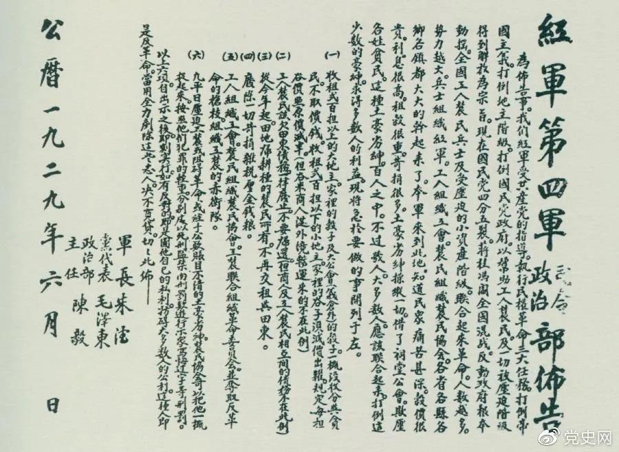 1929年6月,朱德、毛泽东、陈毅联合署名的红四军司令部、政治部布告。