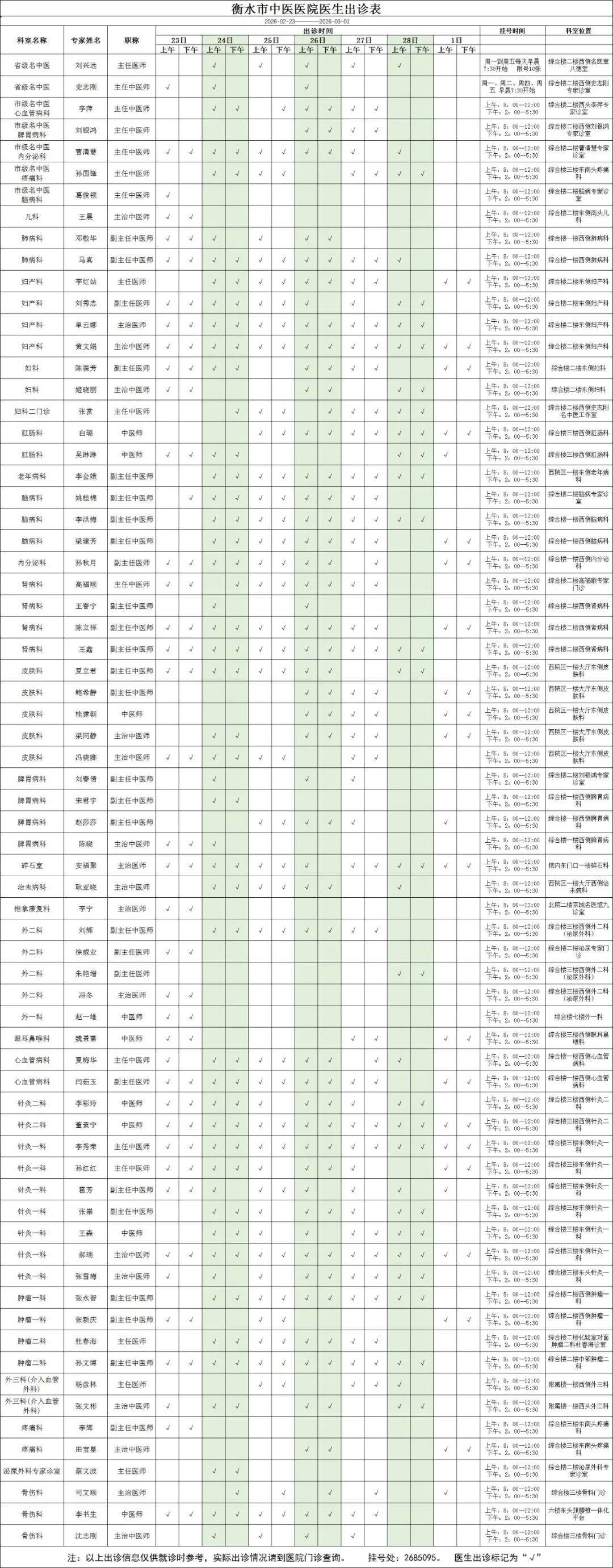 【出诊我先知】衡水市中医医院一周出诊表(2026.2.23-3.1)